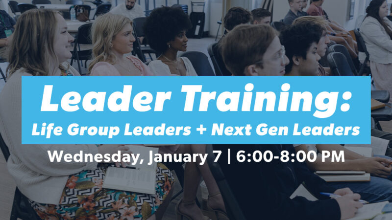 Join us for our Winter 2026 Leader Training on Wednesday, January 7, from 6:00–8:00 p.m. We’ll gather in the Fellowship Hall for dinner before breaking out into ministry-specific sessions designed to equip and encourage you for the semester ahead. This training is for all Life Group and Next Gen leaders.