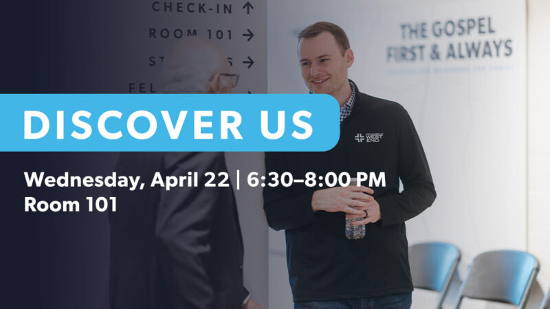 Take your next step at The Church at West End by joining us for Discover Us on Wednesday, April 22, from 6:30–8:00 p.m., and Discover You on Wednesday, April 29, from 6:30–8:00 p.m. in Room 101. These classes are part of our membership process and will help you learn who we are, what we believe, how to get connected, and how God has uniquely shaped you to serve. Register today and take a meaningful step toward deeper community and purpose.